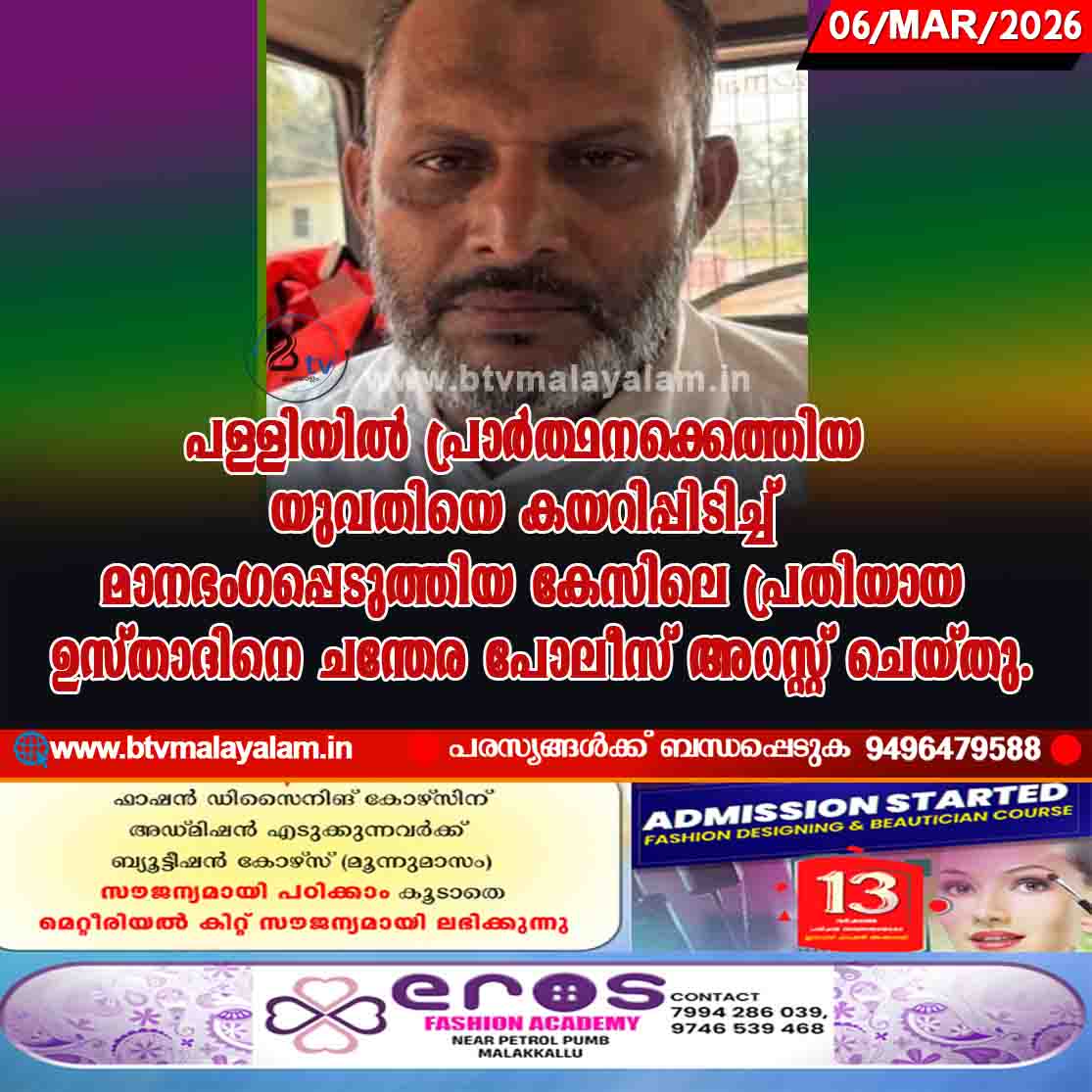 ചെറുവത്തൂര്: പള്ളിയില് പ്രാര്ത്ഥനക്കെത്തിയ യുവതിയെ കയറിപ്പിടിച്ച് മാനഭംഗപ്പെടുത്തിയ കേസിലെ പ്രതിയായ ഉസ്താദിനെ ചന്തേര പോലീസ് അറസ്റ്റ് ചെയ്തു. പടന്ന മടക്കര തുരുത്തിയിലെ കോട്ടപ്പള്ളി മഖാമിലെ ഉസ്താദ് വയനാട്…