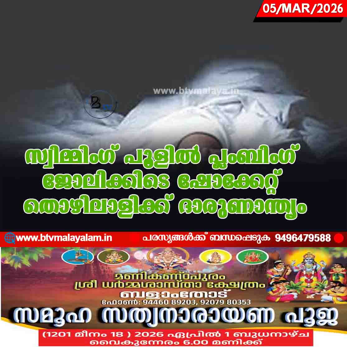 കാസർകോട്: സ്വിമ്മിംഗ് പൂളില് പ്ലംബിംഗ് ജോലിക്കിടെ ഷോക്കേറ്റ് തൊഴിലാളിക്ക് ദാരുണാന്ത്യം. ബെള്ളൂർ മുക്കടംഗോളിയിലെ ചിക്കപ്പറൈ, രത്നാവതി ദമ്പതികളുടെ മകൻ പ്രഭാകര റൈ (39) ആണ് മരിച്ചത്. മധൂർ…