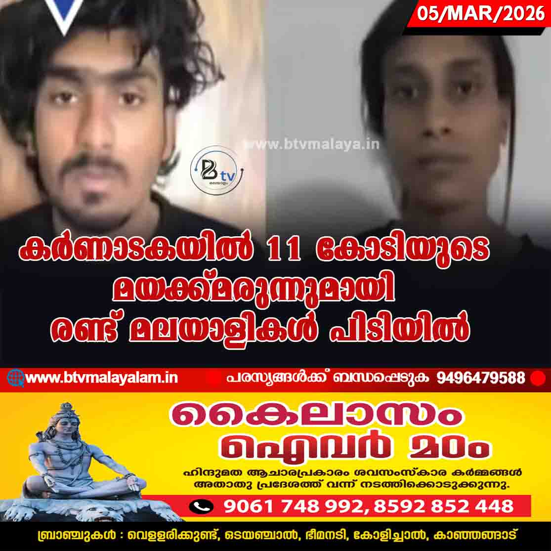 ബെംഗളൂരു | കര്ണാടകയില് കോടികളുടെ മയക്കുമരുന്നുമായി രണ്ട് പേര് പിടിയില്. 11 കോടി രൂപയുടെ മയക്കുമരുന്നുമായി രണ്ട് മലയാളികളാണ് അറസ്റ്റിലായിരിക്കുന്നത്. അശ്വിന് ഷിജു (25), മുബീന നിസ…