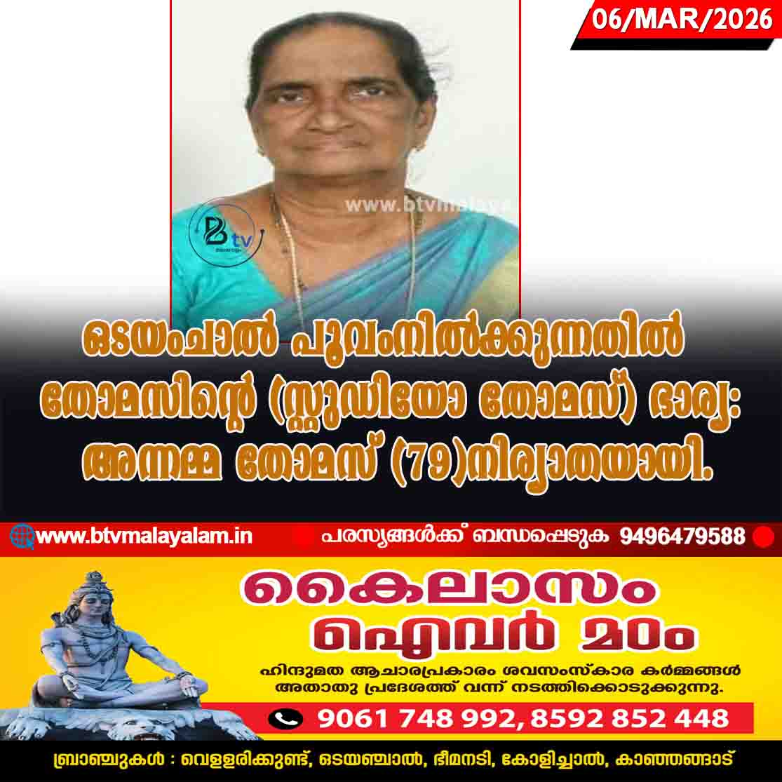 രാജപുരം: ഒടയംചാൽ പൂവംനിൽക്കുന്നതിൽ തോമസിൻ്റെ (സ്റ്റുഡിയോ തോമസ്) ഭാര്യ: അന്നമ്മ തോമസ് (79)നിര്യാതയായി. സംസ്കാരം 07-03-2026 രാവിലെ 10 മണിക്ക് പടിമരുത് സെൻ്റ് സെബാസ്റ്റ്യൻസ് പള്ളി സെമിത്തേരിയിൽ.…