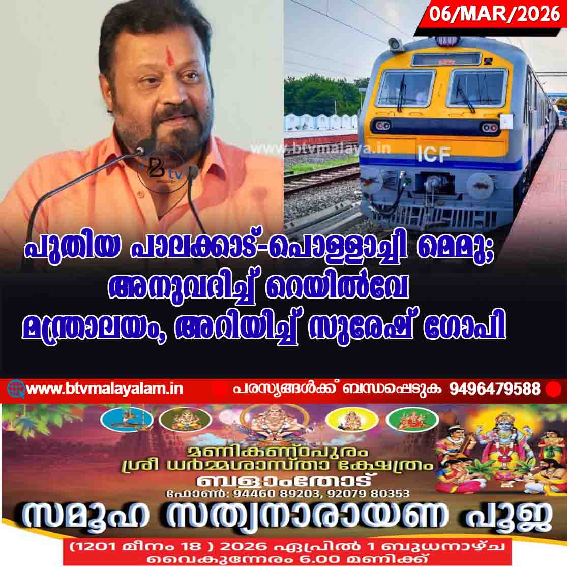 പാലക്കാട്: പാലക്കാട് നിന്ന് പൊള്ളാച്ചിയിലേക്ക് പുതിയ മെമു ട്രെയിൻ അനുവദിച്ചതായി കേന്ദ്രമന്ത്രി സുരേഷ് ഗോപി എംപി. റെയിൽവേ മന്ത്രി അശ്വിനി വൈഷ്ണവിൽ നിന്നും അനുമതി ലഭിച്ചതായും ദീർഘനാളത്തെ…