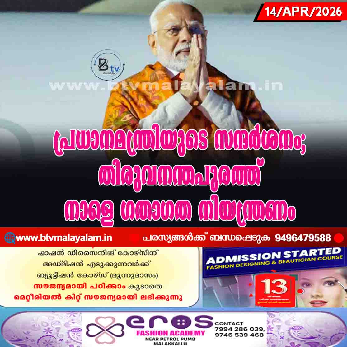 തിരുവനന്തപുരം: പ്രധാനമന്ത്രി നരേന്ദ്രമോദിയുടെ സന്ദര്ശനത്തോട് അനുബന്ധിച്ച് നാളെ തിരുവനന്തപുരം നഗരത്തില് ഗതാഗത നിയന്ത്രണം. ഏപ്രില് 15-ന് ഉച്ചയ്ക്ക് 11.30 മുതല് രാത്രി ഏഴുമണിവരെയാണ് നിയന്ത്രണമേര്പ്പെടുത്തിയിരിക്കുന്നത്. പ്രധാനമന്ത്രിയുടെ യാത്രാ…