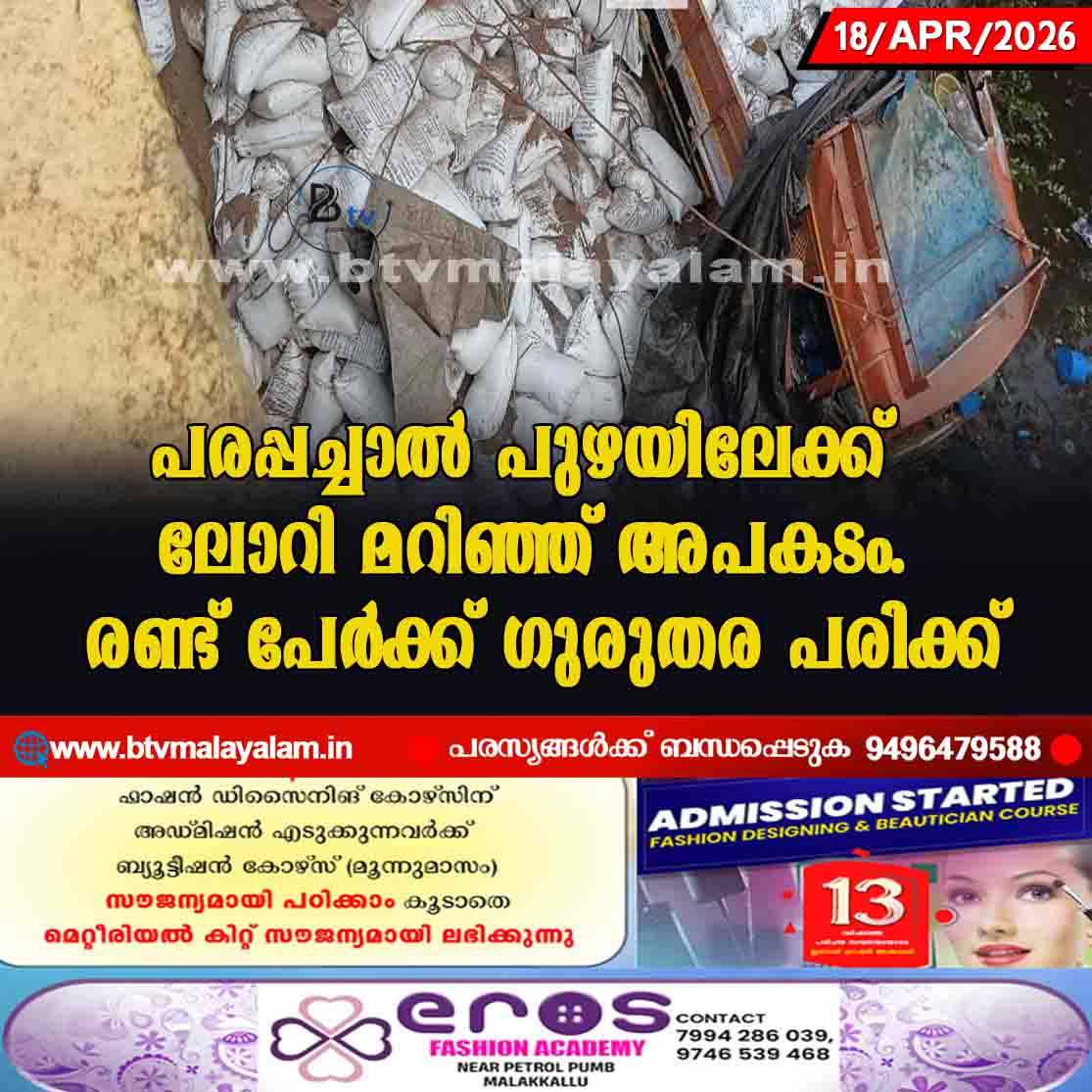 കുന്നുംകൈ : പരപ്പച്ചാൽ പുഴയിലേക്ക് ലോറി മറിഞ്ഞ് അപകടം. രണ്ട് പേർക്ക് ഗുരുതരപരിക്ക്. ഇന്ന് ശനിയാഴ്ച രാവിലെ എട്ടു മണിയോടെആണ് അപകടം. തമിഴ് നാട്ടിൽ നിന്നും വളം…