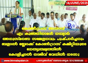 മുൻAICC മെമ്പർ Ex MLA എന്നീ നിലകളിൽ പ്രവർത്തിച്ച പ്രമുഖ കോൺഗ്രസ് നേതാവ് എം കുഞ്ഞിരാമൻ നമ്പ്യാർ അനുസ്മരണ സമ്മേളനവും പുഷ്പാർച്ചനും ബളാൽ ബ്ലോക്ക് കോൺഗ്രസ് കമ്മിറ്റിയുടെ നേത്യുത്ഥ്വത്തിൽ കോളിച്ചാൽ രാജീവ് ഭവനിൽ നടന്നു പൊതു രംഗത്ത് സാധാരണ ജനങ്ങൾക്കൊപ്പം നിന്ന് അവരുടെ അടിസ്ഥാന സൗകര്യങ്ങൾക്ക് വേണ്ടി നിലയുറപ്പിച്ച് ആരോഗ്യ – വിദ്യാഭ്യാസ രംഗത്ത് തന്റേതായ വ്യക്തി മുദ്ര പതിപ്പിച്ച കുഞ്ഞിരാമൻ നമ്പ്യാർ ഇന്നുംജന ഹൃദയങ്ങളിൽഅനിക്ഷേധ്യമായ അംഗീകാരവും സ്മരണയും നിലനിർത്തുന്ന വ്യക്തിത്വത്തിന് ഉടമയാണെന്നും അദ്ദേഹത്തെ പോലെയുള്ള നേതാക്കളെയാണ് ഇന്നിന്റെ രാഷ്ടീയത്തിന് അനിവാര്യമെന്നും അനുസ്മരണ പ്രഭാക്ഷണം ഉദ്ഘാടനം ചെയ്ത് കൊണ്ട് DCC പ്രസിഡന്റ് പി.കെ,ഫൈസൽ പറഞ്ഞു ബ്ലോക്ക് പ്രസിഡന്റ് മധുസൂധനൻ ബാലൂർ അദ്ധ്യക്ഷത വഹിച്ച ചടങ്ങിൽ പ്രഫ: ഖാദർ മാങ്ങാട് അനുസ്മരണ പ്രഭാക്ഷണം നടത്തി KPCC മെമ്പർ – മീനാക്ഷി ബാലകൃഷ്ണൻ, DCC വൈ: പ്രസിഡന്റ് മാരായ ജയിംസ് പന്തമാക്കൽ Bp പ്രദീപ് കുമാർ DCC സെക്രട്ടറിമാരായ പി.വി.സുരേഷ് ഹരിഷ്P നായർ, കരിക്കൈ പഞ്ചായത്ത് പ്രസിഡന്റ് – യു – ബാലചന്ദ്രൻനായർബ്ലോക്ക് വൈ.പ്രസിഡന്റ് മാരായ സി.കൃഷ്ണൻ നായർ, പി.എ. ആലി,എം.യു. തോമസ്,നാരായണൻ ചുള്ളിക്കര മണ്ഡലം പ്രസിഡന്റ്മാരായ – കെ.ജെ.ജയിംസ്, വി.ബാലകൃഷ്ണൻ ബാലൂർ, എം.എം.സൈമൺ,കുഞ്ഞമ്പുനായർഅൻജ്ഞനമുക്കൂട്, വേണുഗോപാലൻനമ്പ്യാർ, ബാബു കദളി മറ്റം,വി.കെ.ബാലകൃഷ്ണൻ മാസ്റ്റർ, സണ്ണി ഇലവും ങ്കൽ, ജോസ് ആശാരി കുന്നേൽ, സുരേന്ദ്രൻ അരിങ്കല്ല്, TP പ്രസന്നൻ, എം.കെ.ദിവാകരൻ, രാധാകൃഷ്ണൻനായർ, ബ്ലോക്ക് പഞ്ചായത്ത് മെമ്പർ – രേഖ സി,പഞ്ചായത്ത് മെമ്പർമാരായ എൻ.വിൻസെന്റെ, വന്നജഐത്തു. രാധാ സുകുമാരൻ, പത്ന്മാവതി എം.കുഞ്ഞിരാമൻ അയ്യങ്കാവ് വിനോദ്കപ്പിത്താൻ, മുരളി പനങ്ങാട്, KK യൂസഫ്, ജയകുമാർ,, അജീഷ്, അനിൽ കുമാർ, യോഗേഷ് എന്നിവർസംസാരിച്ച ചടങ്ങിന് ബ്ലോക്ക് സെക്രട്ടറിമാരായ – സജി പ്ലാച്ചേരി സ്വാഗതവും പി.കെ.ബാലചന്ദ്രൻ നന്ദിയും പറഞ്ഞു