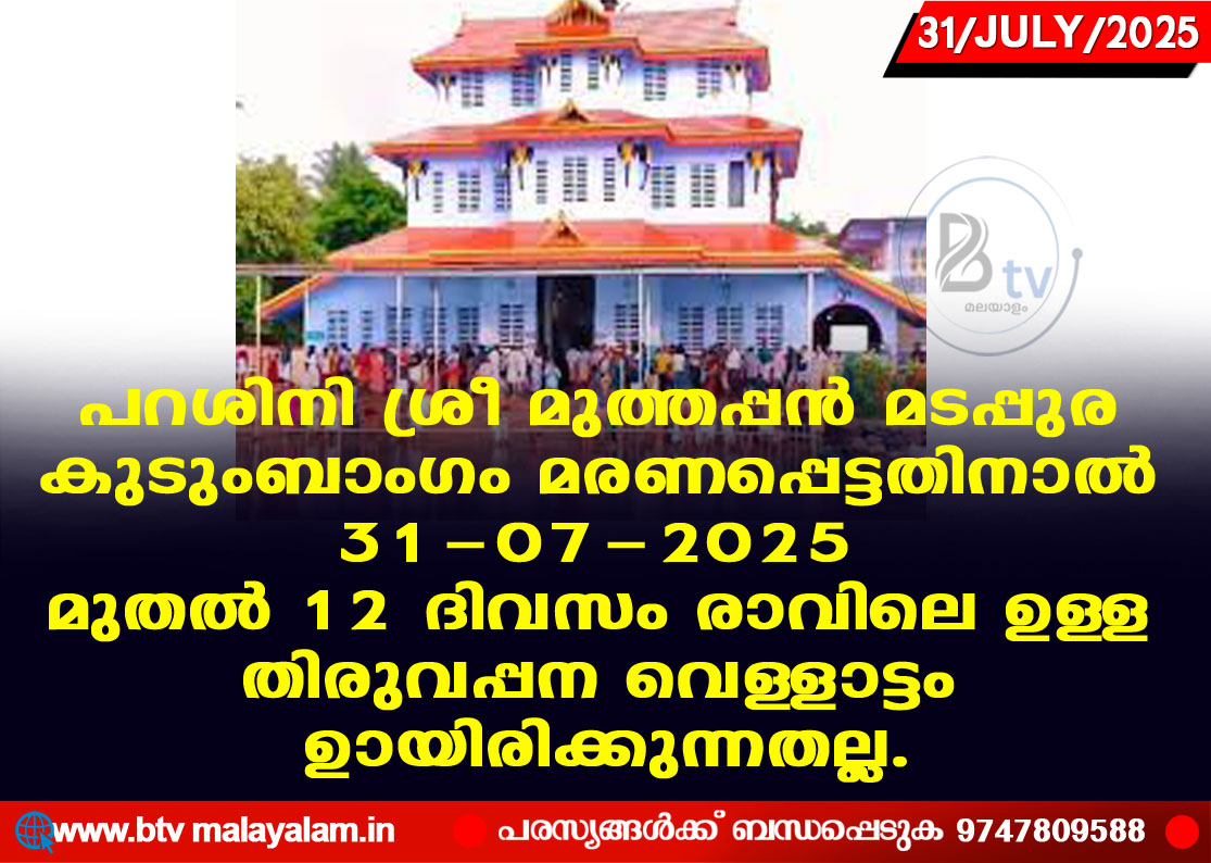 പറശിനി ശ്രീ മുത്തപ്പൻ മടപ്പുര കുടുംബാംഗം മരണപ്പെട്ടതിനാൽ 31-07-2025 മുതൽ 12 ദിവസം രാവിലെ ഉള്ള തിരുവപ്പന വെള്ളാട്ടം ഉണ്ടായിരിക്കുന്നതല്ല. ഉച്ച വെള്ളാട്ടം മാത്രം ഉണ്ടായിരിക്കുന്നതാണ്