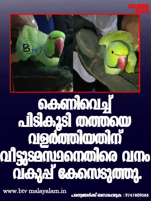 കൊയിലാണ്ടി: കോഴിക്കോട് നരിക്കുനി ഭാഗത്തുള്ള വയലിൽ നിന്ന് കെണിവെച്ച് പിടികൂടി തത്തയെ വളർത്തിയതിന് വീട്ടുടമസ്ഥനെതിരെ വനം വകുപ്പ് കേസെടുത്തു. നരിക്കുനി പഞ്ചായത്തിലെ ഭരണിപ്പാറ കുടുക്കിൽ എന്ന വീട്ടിൽ…