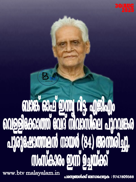 കാഞ്ഞങ്ങാട് : ബാങ്ക് ഓഫ് ഇന്ത്യ റിട്ട. എജിഎം വെള്ളിക്കോത്ത് വേദ് നിവാസിലെ പുറവങ്കര പുരുഷോത്തമൻ നായർ (84) അന്തരിച്ചു. സംസ്കാരം ഇന്ന് ഉച്ചയ്ക്ക് മൂന്ന് മണിക്ക്…
