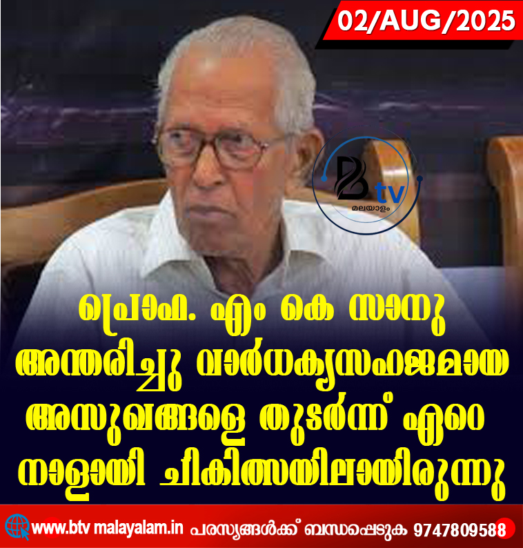 കൊച്ചി: എഴുത്തുകാരനും ചിന്തകനുമായ പ്രൊഫ. എം കെ സാനു അന്തരിച്ചു. 99 വയസായിരുന്നു. വീണ് പരിക്കേറ്റതിനെ തുടർന്ന് ഒരാഴ്ചയിലേറെയായി ചികിത്സയിലായിരുന്നു. കൊച്ചിയിലെ അമൃത ആശുപത്രിയിൽ ആയിരുന്നു അന്ത്യം.…