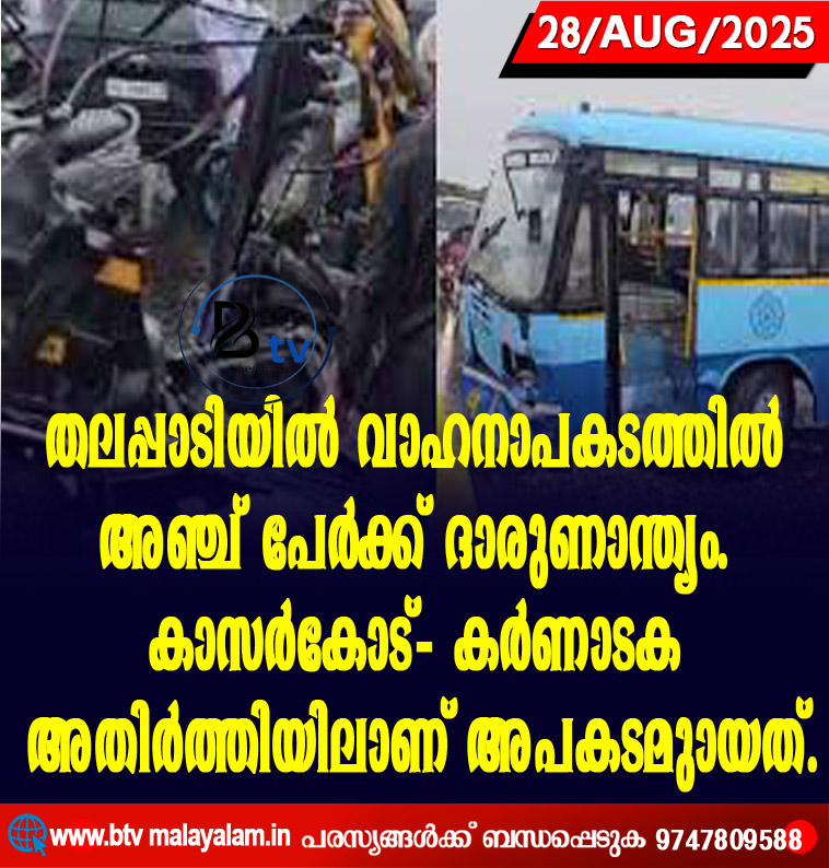 കാസർകോട്: തലപ്പാടിയിൽ വാഹനാപകടത്തിൽ അഞ്ച് പേർക്ക് ദാരുണാന്ത്യം. കാസർകോട്- കർണാടക അതിർത്തിയിലാണ് അപകടമുണ്ടായത്. അമിതവേഗതയിലെത്തിയ കർണാടക ആർടിസി ബസ് നിയന്ത്രണംവിട്ട് ബസ്കാത്തിരിപ്പു കേന്ദ്രത്തിലേക്കും പിന്നാലെ ഓട്ടോറിക്ഷയിലേക്കും ഇടിച്ചു…