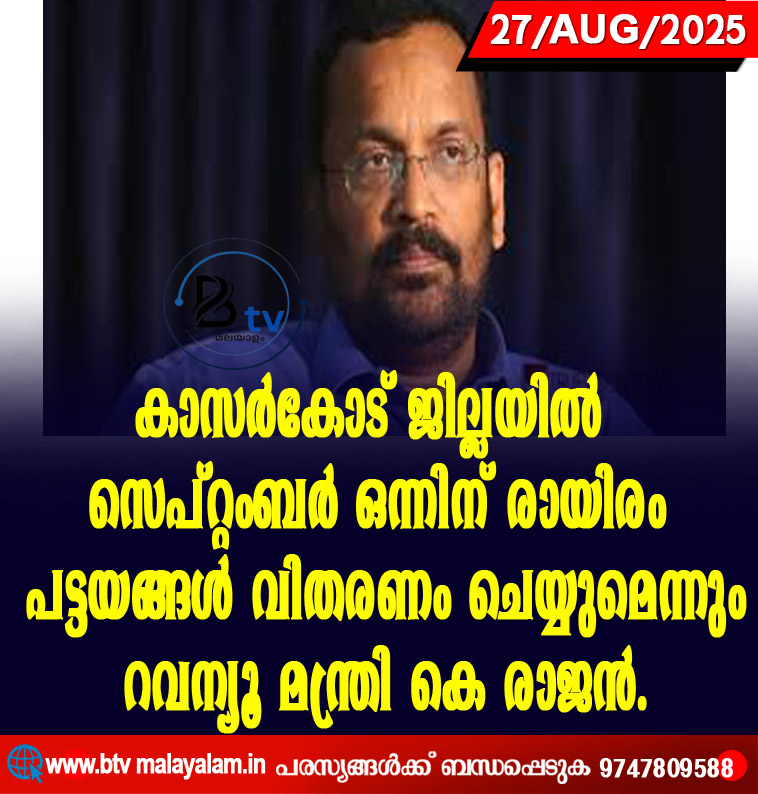 കാസർകോട് ജില്ലയിൽ സെപ്റ്റംബർ ഒന്നിന് രണ്ടായിരം പട്ടയങ്ങൾ വിതരണം ചെയ്യുമെന്നും ഇത് ജില്ലയെ സംബന്ധിച്ചിടത്തോളം ചരിത്രമാകുമെന്നും റവന്യൂ മന്ത്രി കെ രാജൻ. തിരുവനന്തപുരത്ത് ഐഎല്ഡിഎമ്മില് (ഇൻസ്റ്റിറ്റ്യൂട്ട് ഓഫ്…