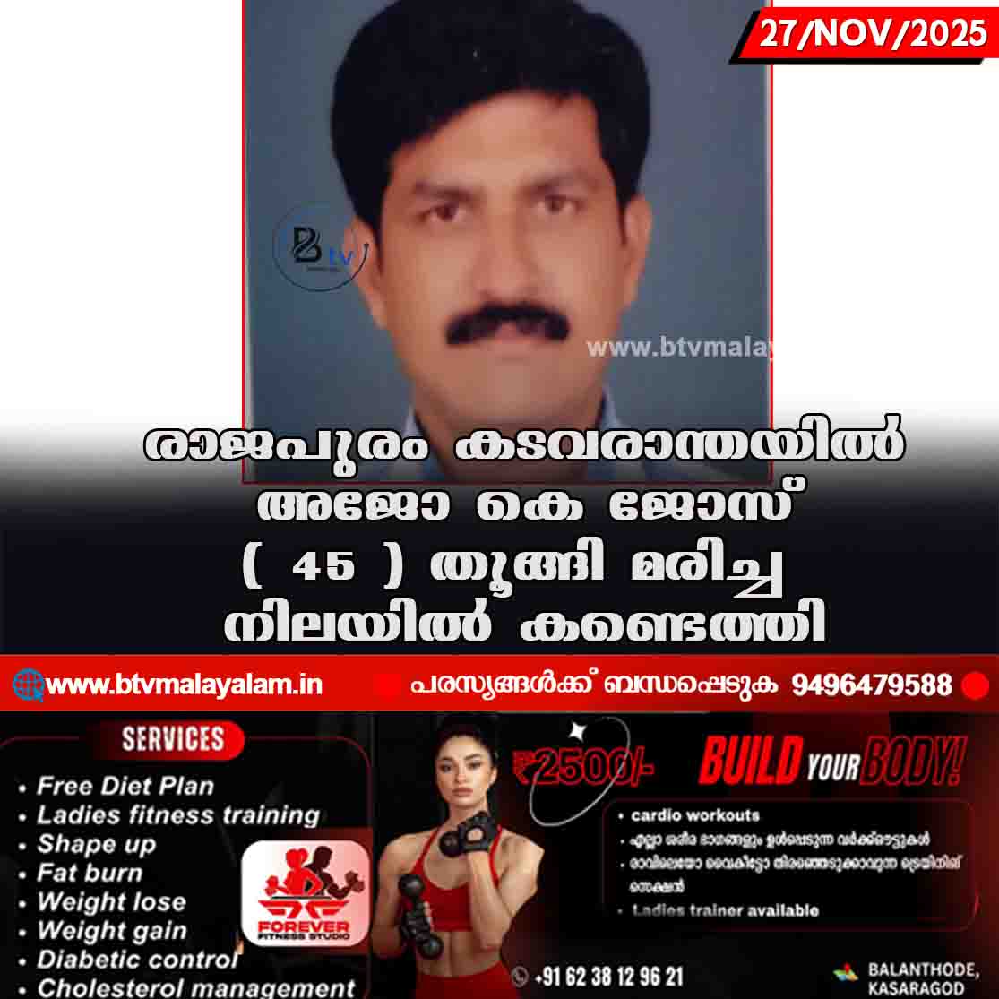 രാജപുരം: രാജപുരം കടവരാന്തയിൽ യുവാവിനെ തൂങ്ങി മരിച്ച നിലയിൽ കണ്ടെത്തി. രാജപുരം ഒന്നാം മൈലിലെ കെ.സി. ജോസിന്റെ മകൻ അജോ കെ ജോസ് ( 45 )…