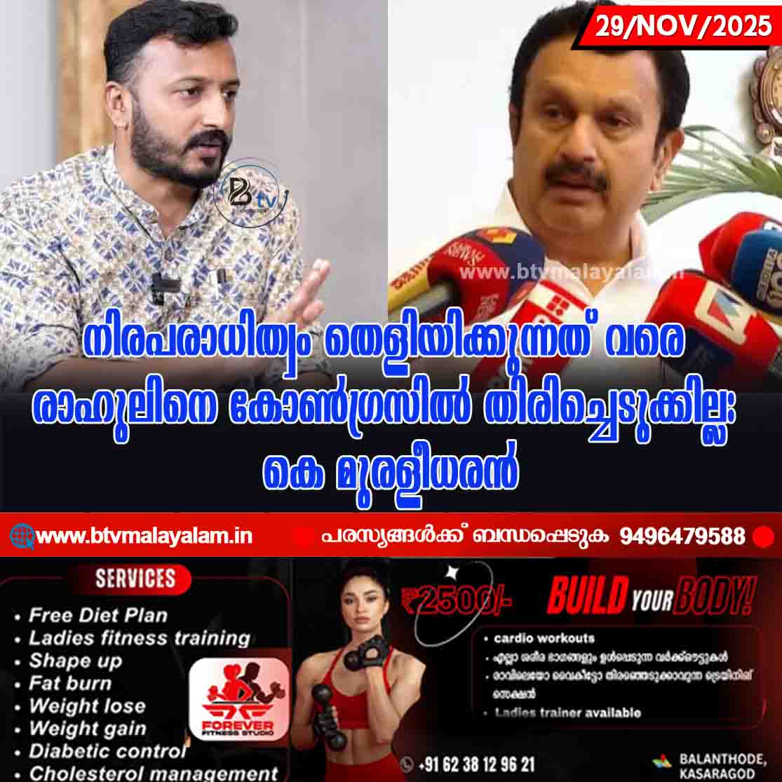 തിരുവനന്തപുരം: നിരപരാധിത്വം തെളിയിക്കുന്നത് വരെ രാഹുല് മാങ്കൂട്ടത്തില് എംഎല്എയെ കോണ്ഗ്രസില് തിരിച്ചെടുക്കില്ലെന്ന് മുതിര്ന്ന കോണ്ഗ്രസ് നേതാവ് കെ മുരളീധരന്. രാഹുല് മാങ്കൂട്ടത്തിലിൻ്റെ പ്രവൃത്തിയെ ന്യായീകരിക്കാന് പാര്ട്ടിയോ പാര്ട്ടി…