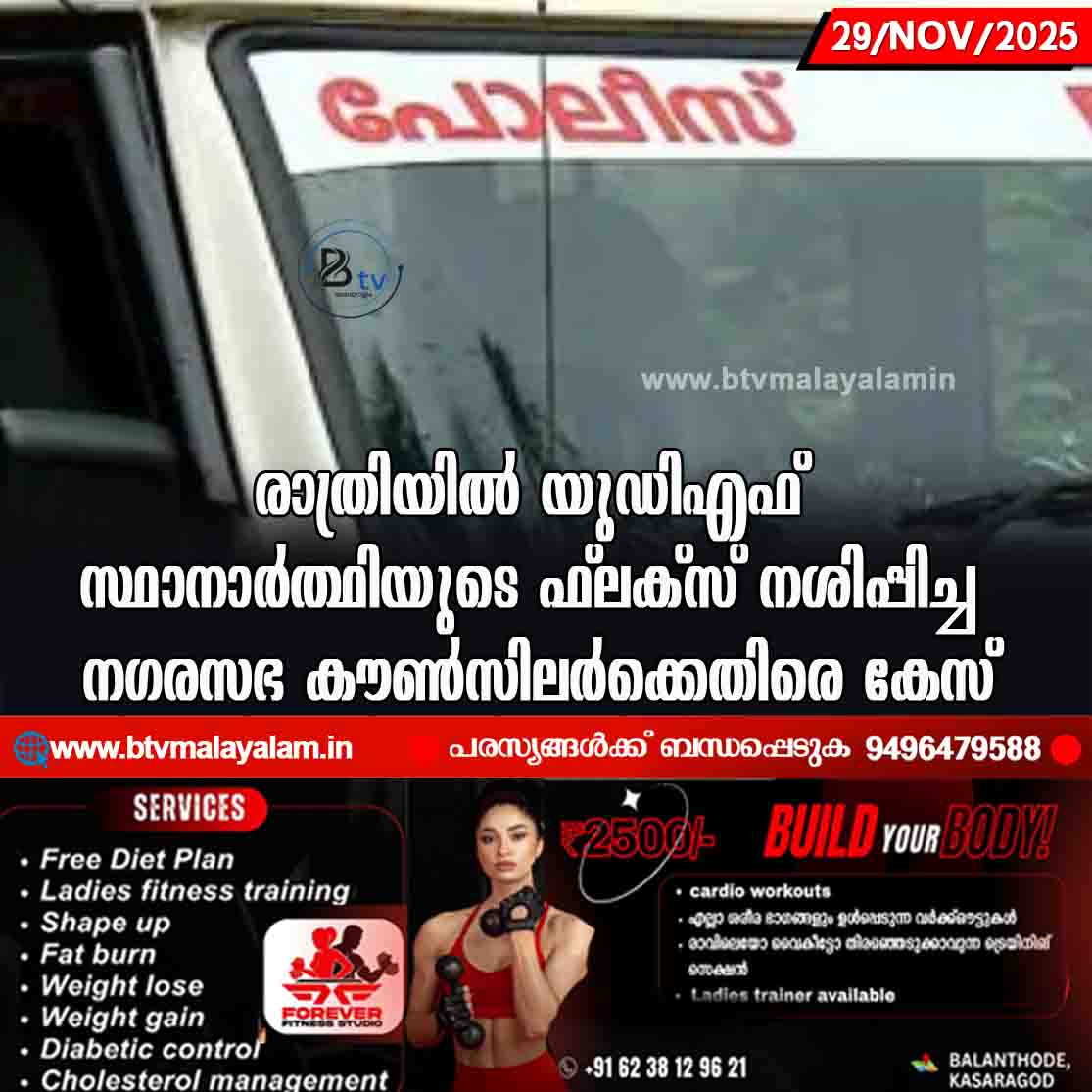 നീലേശ്വരം: കാഞ്ഞങ്ങാട് നഗരസഭയിലെ 22 -ാം വാര്ഡ് യുഡിഎഫ് സ്ഥാനാര്ത്ഥി ഭാരതിയുടെ തിരഞ്ഞെടുപ്പ് പ്രചരണ ഫ്ളക്സ് ബോര്ഡുകള് രാത്രിയുടെ മറവില് എടുത്തുകൊണ്ടുപോയ സംഭവത്തില് കാഞ്ഞങ്ങാട് നഗരസഭാ കൗണ്സിലര്…