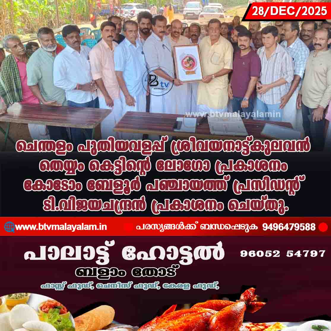 അട്ടേങ്ങാനം:2026 എപ്രിൽ 3,4,5 തീയ്യതികളിൽ നടക്കുന്ന ബാത്തൂർ ശ്രീഭഗവതിക്ഷേത്രപരിധിയിലെ കരിച്ചേരി തറവാട് കോയ്മയായുള്ള ചെന്തളം പുതിയവളപ്പ് ശ്രീവയനാട്ട്കുലവൻ തെയ്യം കെട്ടിന്റെ ലോഗോ കോടോം ബേളൂർ പഞ്ചായത്ത് പ്രസിഡൻ്റ്…