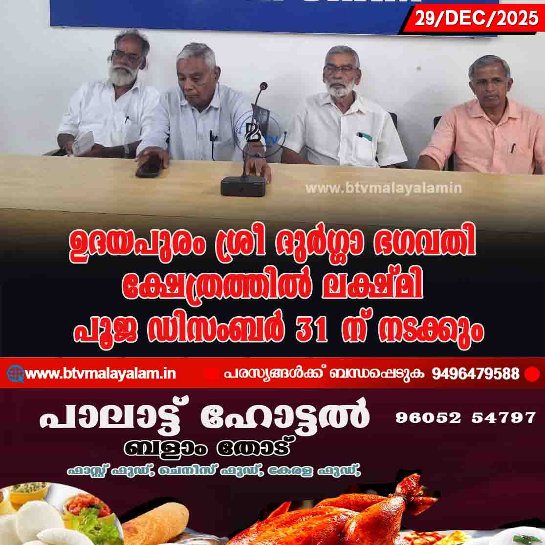 രാജപുരം : ഉദയപുരം ദുർഗ്ഗാ ഭഗവതി ക്ഷേത്രത്തിൽ എല്ലാ വർഷവും നെല്ല് പുജിക്കുന്ന അപൂർവ ചടങ്ങായ ലക്ഷ്മി പൂജ ബുധനാഴ്ച ( ഡിസംബർ 31)രാവിലെ 10 മണിക്ക്…