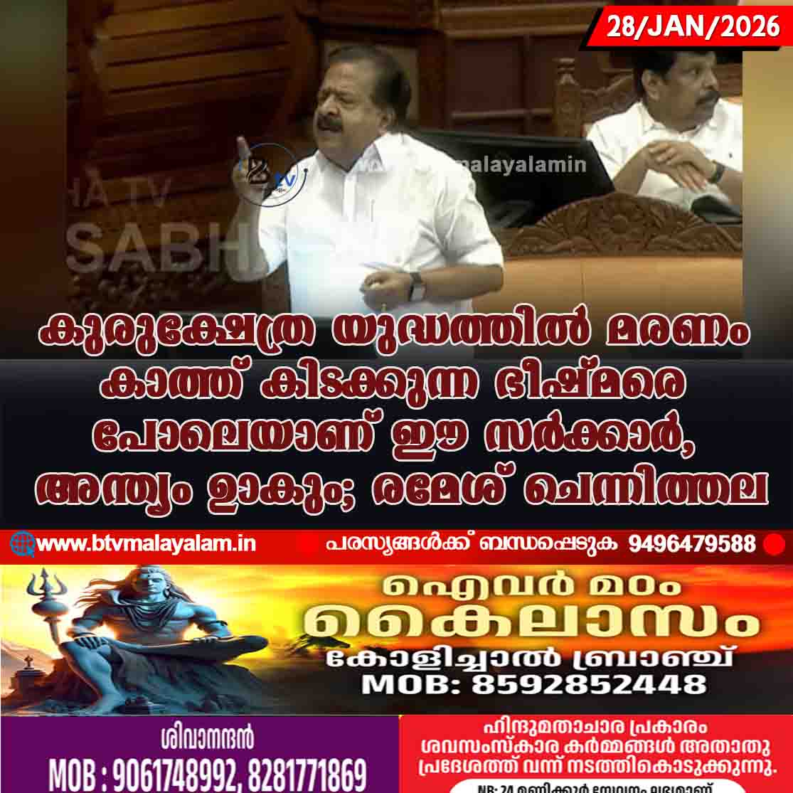 തിരുവനന്തപുരം: കുരുക്ഷേത്ര യുദ്ധത്തിൽ മരണം കാത്ത് കിടക്കുന്ന ശരശയ്യയിലെ ഭീഷ്മരെ പോലെയാണ് ഈ സർക്കാരെന്ന് കോൺഗ്രസ് നേതാവ് രമേശ് ചെന്നിത്തല. ഉത്തരായനത്തിൽ എത്തിയാൽ മരണം സംഭവിക്കുമെന്നത് യാഥാർത്ഥ്യമാണ്.…