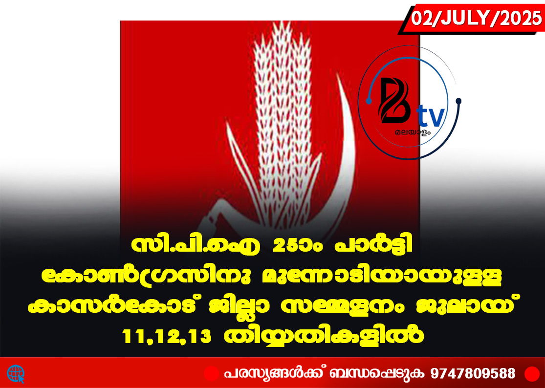 വെള്ളരിക്കുണ്ട്: സി.പി.ഐ 25ാം പാർട്ടി കോണ്ഗ്രസിനു മുന്നോടിയായുള്ള കാസർകോട് ജില്ലാ സമ്മേളനം ജുലായ് 11,12,13 തീയ്യതികളില് വെള്ളരിക്കുണ്ടില് നടക്കും. 11ന് പതാക, കൊടിമര ജാഥകളും 12, 13…