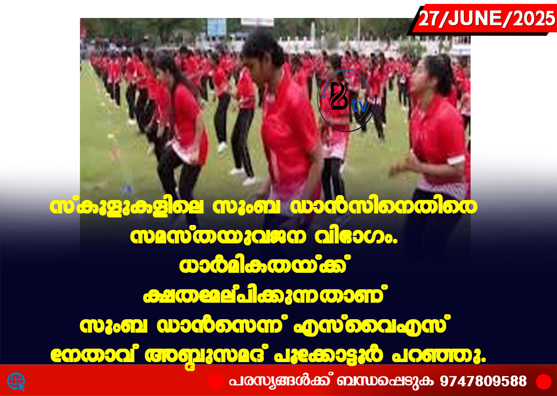 മലപ്പുറം: സ്കൂളുകളിലെ സൂംബ ഡാൻസിനെതിരെ സമസ്ത യുവജന വിഭാഗം. ധാർമികതയ്ക്ക് ക്ഷതമേല്പിക്കുന്നതാണ് സൂംബ ഡാൻസെന്ന് എസ്വൈഎസ് നേതാവ് അബ്ദുസമദ് പൂക്കോട്ടൂർ പറഞ്ഞു. രക്ഷിതാക്കൾ ഉയർന്നു ചിന്തിക്കണമെന്നും ആവശ്യപ്പെട്ടു.…