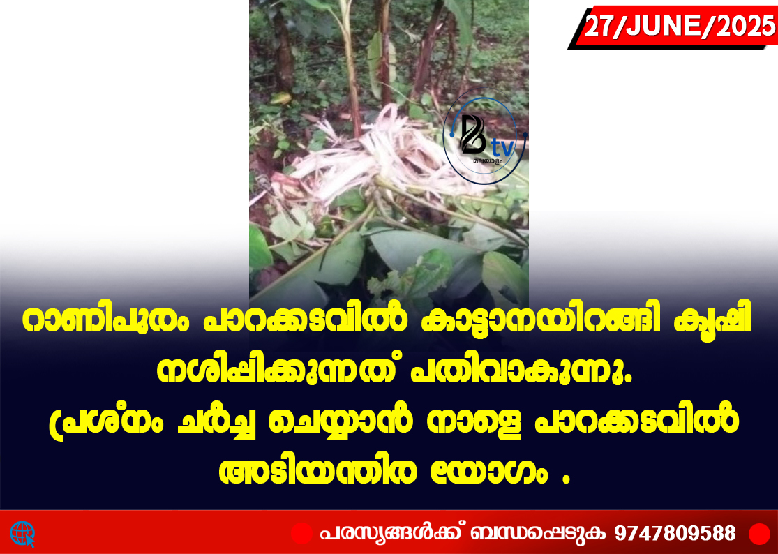 റാണിപുരം – റാണിപുരം പാറക്കടവിൽ ആന ഇറങ്ങി കൃഷി നശിപ്പിക്കുന്നത് പതിവാകുന്നു. തുടച്ചായ മൂന്നാം ദിവസമാണ് പാറക്കടവിൽ ആന ഇറങ്ങുന്നത്. ഇന്നലെ രാത്രിയിൽ പാറക്കടവിലെ കെ.പി സുകുമാരൻ,…