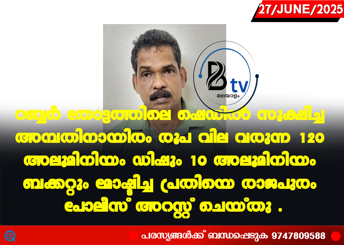 രാജപുരം : കള്ളാർ സ്വദേശി എംഎം ജോസിന്റെ ഉടമസ്ഥതയിലുള്ള കള്ളാർ അരിങ്കല്ലിലെ 4 ഏക്കർ റബ്ബർ തോട്ടത്തിലെ ഷെഡിൽ സൂക്ഷിച്ച അമ്പതിനായിരം രൂപ വില വരുന്ന 120…