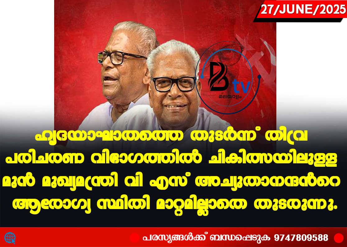തിരുവനന്തപുരം: ഹൃദയാഘാതത്തെ തുടര്ന്ന് തീവ്ര പരിചരണ വിഭാഗത്തിൽ ചികിത്സയിലുള്ള മുന് മുഖ്യമന്ത്രി വി എസ് അച്യുതാനന്ദന്റെ ആരോഗ്യ സ്ഥിതി മാറ്റമില്ലാതെ തുടരുന്നു. തിരുവനന്തപുരത്ത് സ്വകാര്യ ആശുപത്രിയിൽ തീവ്ര…