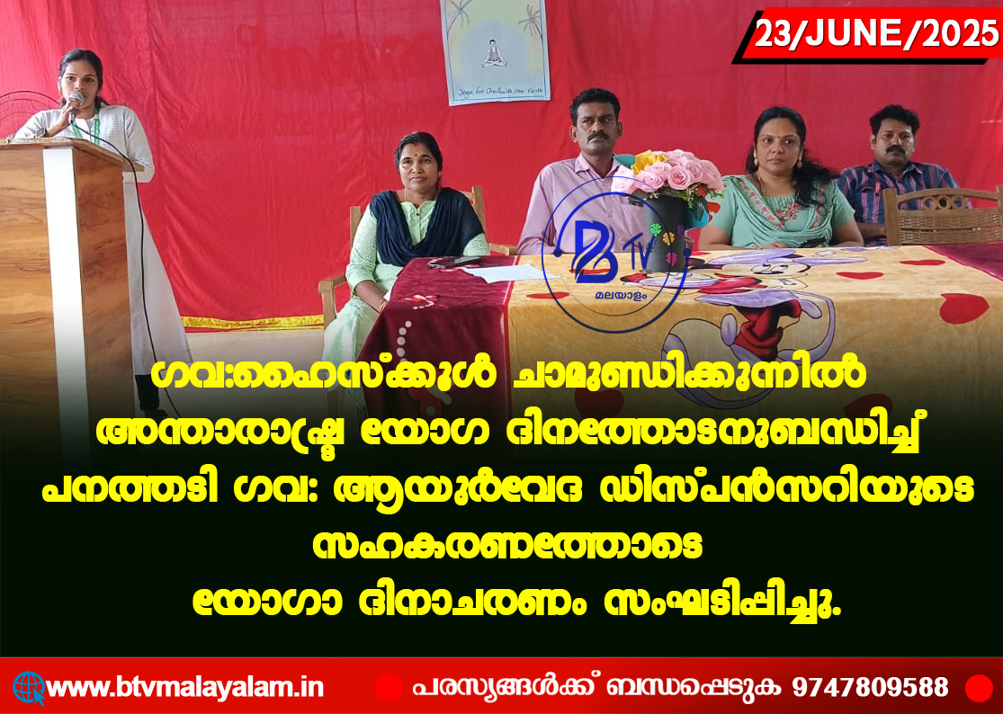ചാമുണ്ഡിക്കുന്ന്: ഗവ:ഹൈസ്ക്കൂൾ ചാമുണ്ഡിക്കുന്നിൽ അന്താരാഷ്ട്ര യോഗ ദിനത്തോടനുബന്ധിച്ച് പനത്തടി ഗവ: ആയുർവേദ ഡിസ്പൻസറിയുടെ സഹകരണത്തോടെ യോഗാ ദിനാചരണം സംഘടിപ്പിച്ചു. സ്കൂൾ ഓഡിറ്റോറിയത്തിൽ നടന്ന ചടങ്ങിൽ സീനിയർ അസിസ്റ്റന്റ്…