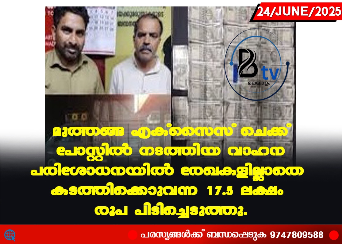 മുത്തങ്ങ എക്സൈസ് ചെക്ക് പോസ്റ്റിൽ നടത്തിയ വാഹന പരിശോധനയിൽ രേഖകളില്ലാതെ കടത്തിക്കൊണ്ടുവന്ന 17.5 ലക്ഷം രൂപ പിടിച്ചെടുത്തു. സംഭവവുമായി ബന്ധപ്പെട്ട് കോഴിക്കോട് സ്വദേശി അബ്ദുൾ ഷുക്കൂർ, ഡ്രൈവർ…