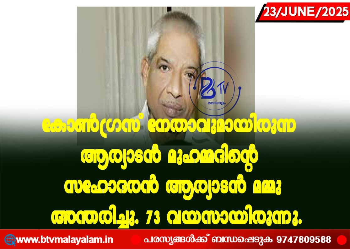 മലപ്പുറം: മുൻമന്ത്രിയും കോൺഗ്രസ് നേതാവുമായിരുന്ന ആര്യാടൻ മുഹമ്മദിൻ്റെ സഹോദരൻ ആര്യാടൻ മമ്മു അന്തരിച്ചു. 73 വയസായിരുന്നു. ഹൃദയാഘാതത്തെ തുടർന്ന് മലപ്പുറം വണ്ടൂരിലെ സ്വകാര്യ ആശുപത്രിയിലായിരുന്നു അന്ത്യം. കബറടക്കം…