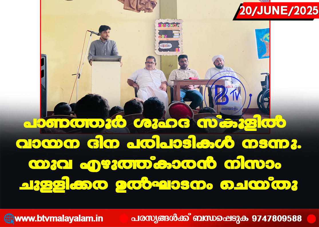 ചുള്ളക്കര: ജൂൺ 19വായന ദിനത്തിൽ പാണ ത്തൂർ ശുഹദ ഇംഗ്ലീഷ് മീഡിയം സ്കൂളിൽ വിവിധ പരിപാടികൾ സംഘടിപ്പിച്ചു. . യുവ എഴുത്തുകാരൻ നിസാം ചുള്ളിക്കര ഉൽഘാടനം ചെയ്തു.…