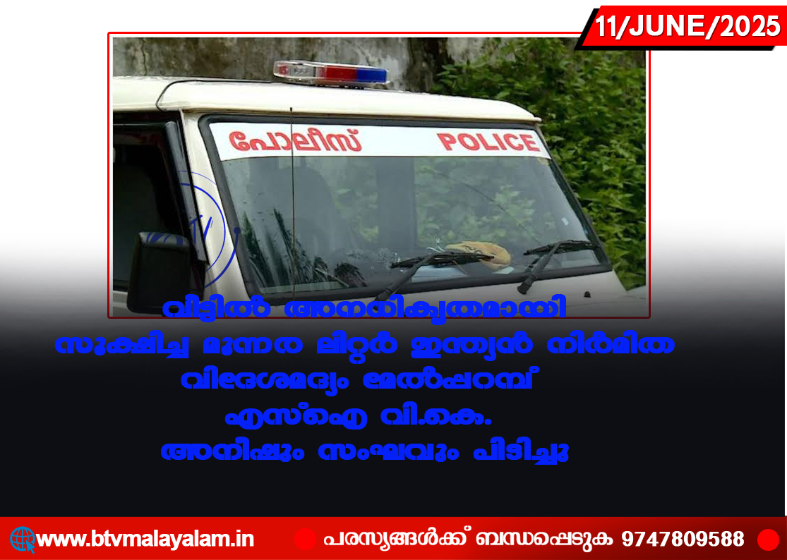 ചട്ടഞ്ചാൽ : പള്ളത്തിങ്കാൽ കുന്നാറയിലെ വീട്ടിൽ അനധികൃതമായി സൂക്ഷിച്ച മൂന്നര ലിറ്റർ ഇന്ത്യൻ നിർമിത വിദേശമദ്യം മേൽപ്പറമ്പ് എസ്ഐ വി.കെ. അനീഷും സംഘവും പിടിച്ചു. രഹസ്യവിവരത്തെ തുടർന്നായിരുന്നു…